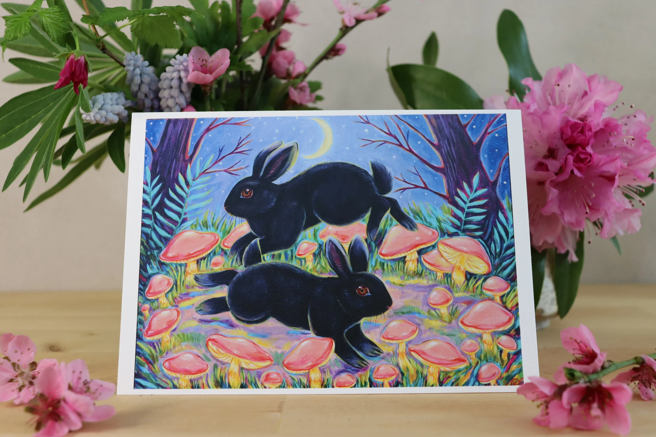 Shop › Magic Faerie Ring Art Card Image 1 of 1 Magic Faerie Ring Art Card CA$6.00 Blank inside. Black bunnies dancing under a crescent moon. Add To Cart Added! Blank inside. Black bunnies dancing under a crescent moon.
